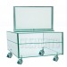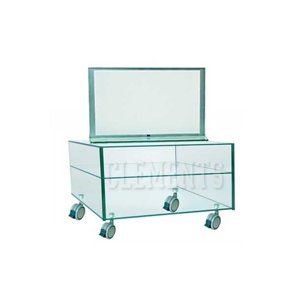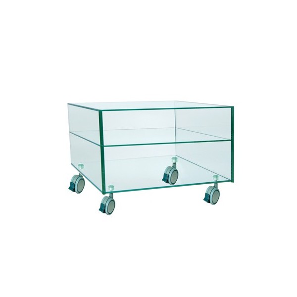 Rectangular cube made of tempered glass wheels with integrated brake system to facilitate movement. Practical and modern design for use as a TV table, auxiliary, decorative objects, etc..