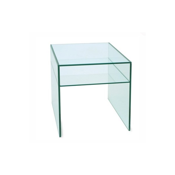 Table basse carrée formée par des lames de verre trempé massif, avec une étagère.