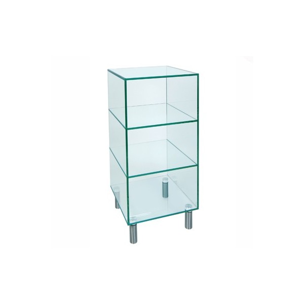 Vitrine avec deux étagères de ligne moderne realisée en verre trempé. Elle s'appuie sur 4 pieds métalliques de couleur argent chromé.