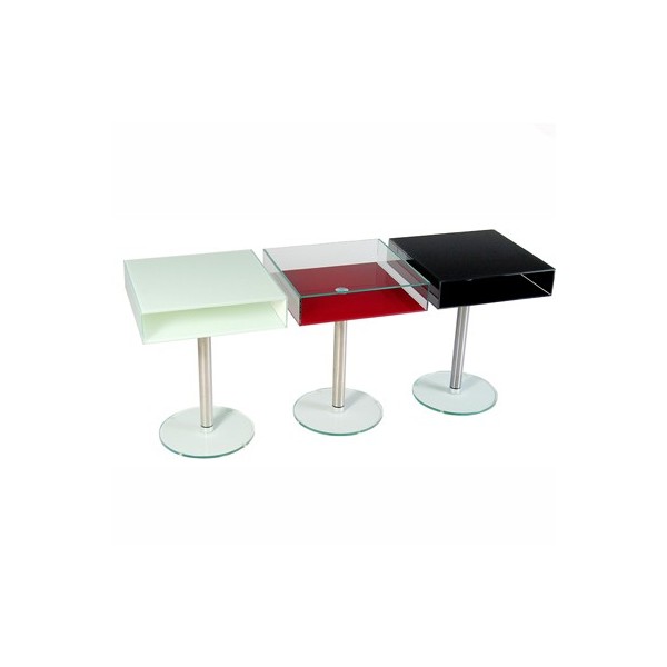 Table basse carrée en verre. Elle dispose d'un espace pour garder les revues, etc. Elle s'appuie sur un pied métallique couleur argent chromé inserté sur une base ronde en verre trempé.
