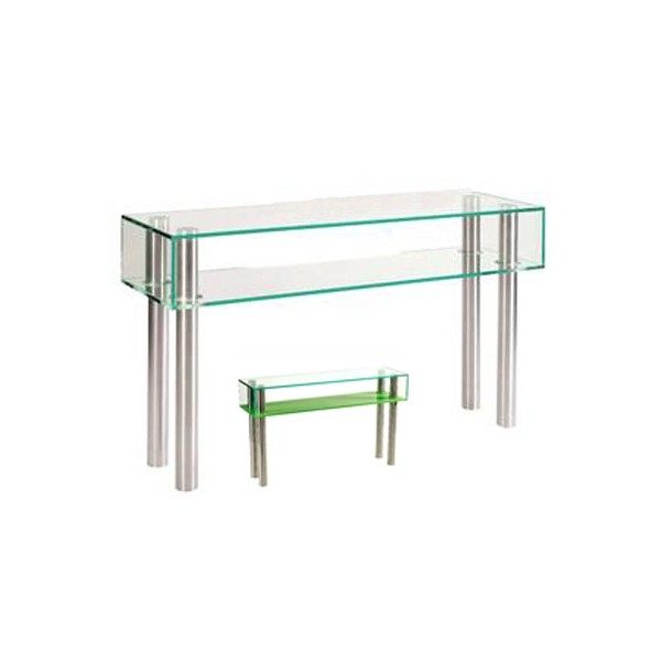 Console en verre trempé avec une étagère. Elle utilise comme appuis 4 tubes cylindriques métalliques de couleur argent chromé.